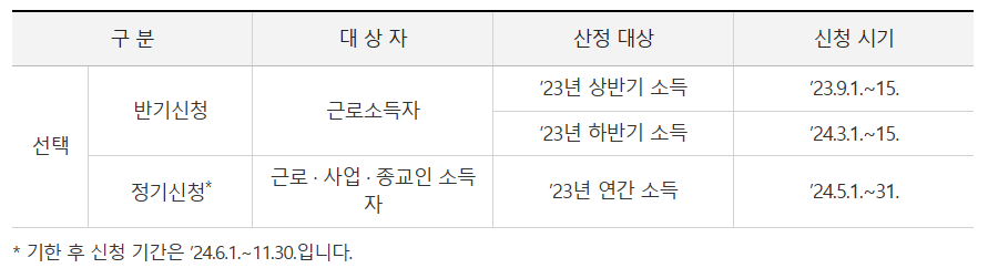 우선 근로소득만 있는 분은 반기신청과 정기신청을 선택하여 신청할 수 있어요. 심사가 통과되면 8월 중에 지급됩니다.